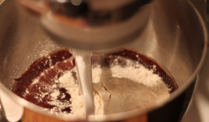 Slowly incorporate the cake flour into the chocolate mixture. Don’t overmix here! Stop right when the flour has all mixed into the chocolate.