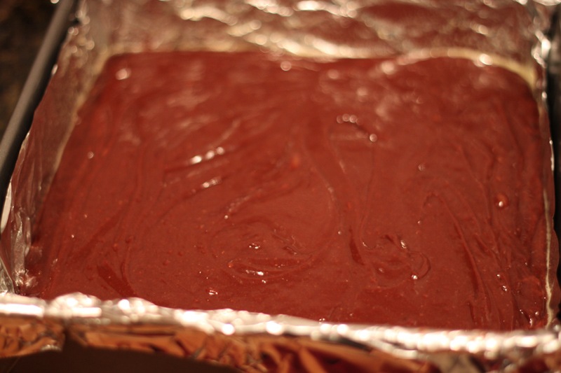 Line a square baking pan (mine was 12×12) with foil, grease, and bake on 350 degrees for 25 minutes. A toothpick inserted into the center should come out somewhat clean but the center should be a bit underdone/fudgey.