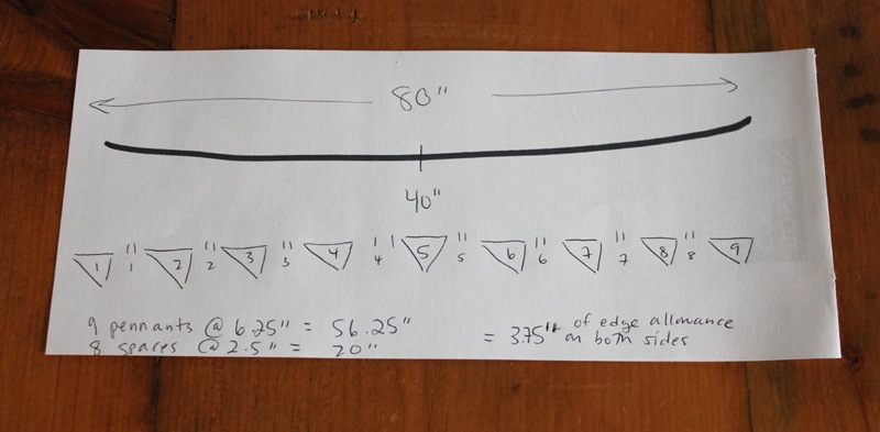 The first step was to draw out all of the measurements so that I could create a pattern and get all of the specs correct. I measured the window frame in the office where I planned to hang my banner, it was 80 inches wide. So I drew up a little schematic: 80 inches total, with one pennant at exactly the halfway point at 40 inches, a standard space between each pennant of 2.5 inches, 4 pennants on each side from the center, with a total of 9 pennants and roughly 4 inches leftover on each end to allow for hanging.