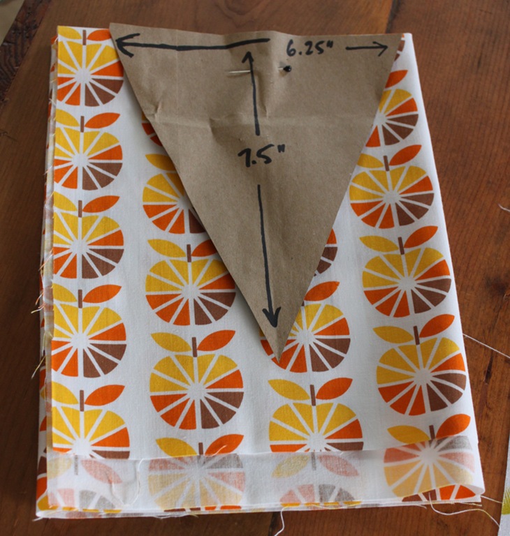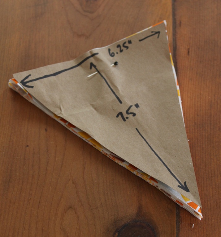 I knew that I wanted a double sided pennant with sewn edges. To create that I folded each piece of fabric in half width-wise, lined my pattern up on the fold, folded the fabric into thirds, pinned the pattern to the front, and cut out the fabric. Hopefully that’s not a confusing explanation but if so, I think the pictures will be clearer.