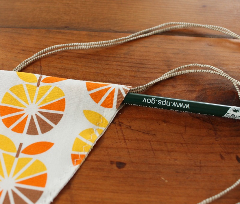 One quick little trick I used to help thread the yarn through the top of each pennant was to gently push it through with the eraser end of a pencil. Worked like a dream!