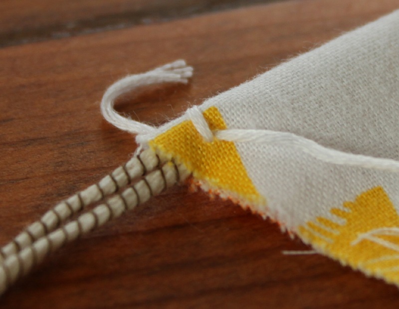 A lot of fabric banners I’ve seen online use a piece of fabric (or bias tape) at the top to sew each pennant to. Since I had this beautiful yarn I didn’t want to go with that style. I still needed a way to affix the pennants to the yarn garland though so they would stay in place/not slide around. I decided to give the top corners of each pennant a little knot dart with embroidery floss. Again, I hope the pictures are helpful to demonstrate exactly how I did this.