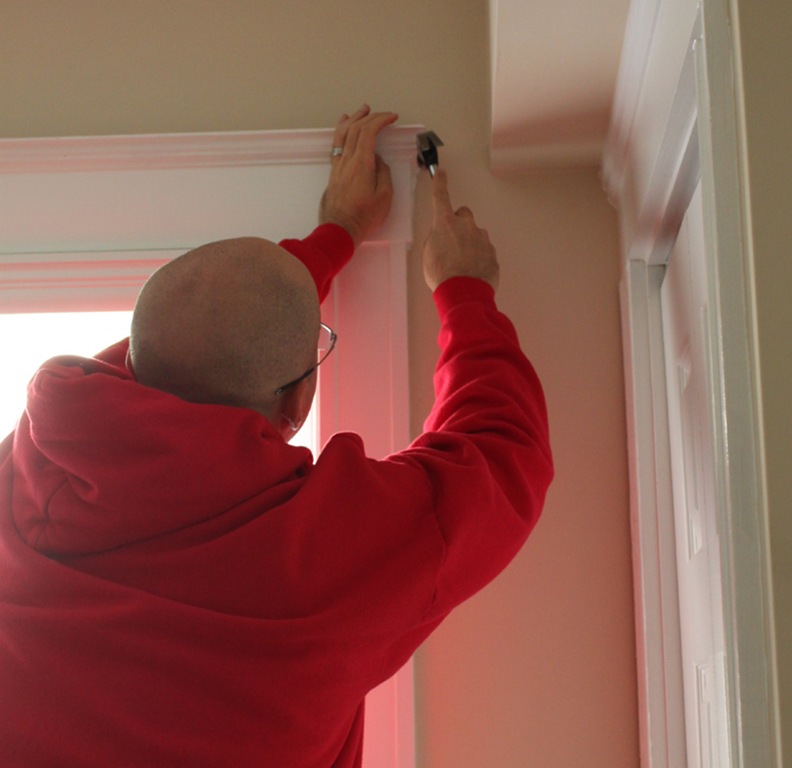 When the banner was done I brought it into the office and called in the hubs for some help. He hammered two nails just next to the window frame and helped me hang the banner up.