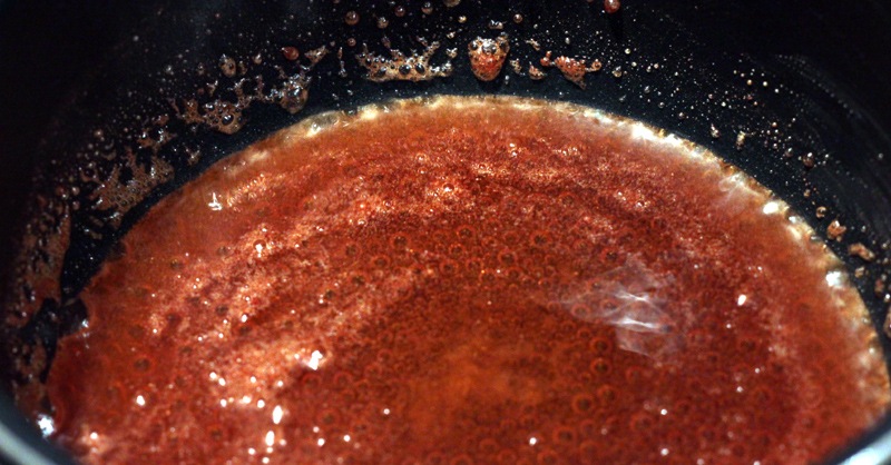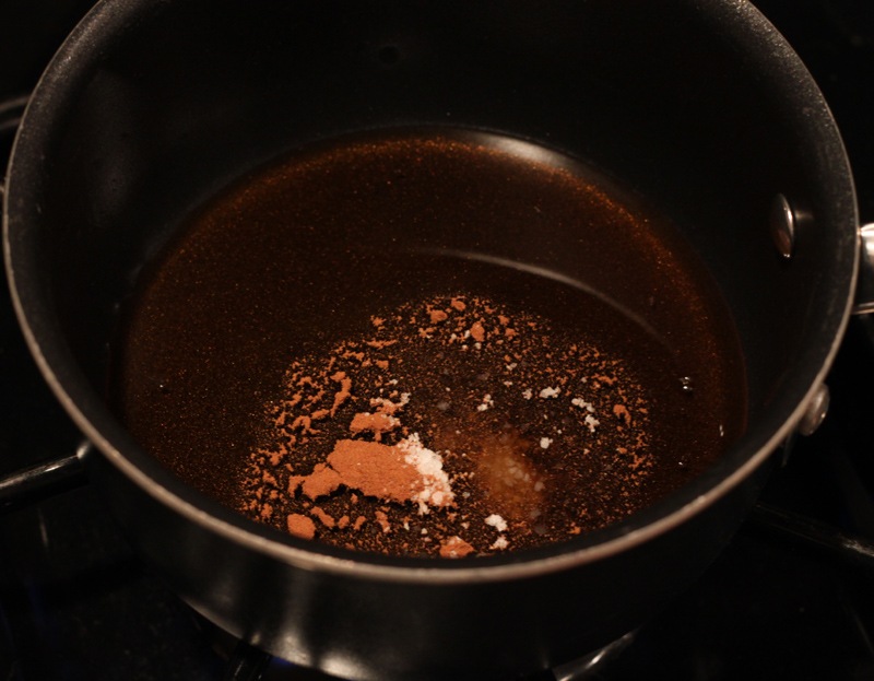 While the base is heating up, make the candied walnuts. Bring the syrup, cinnamon, and salt to a boil.