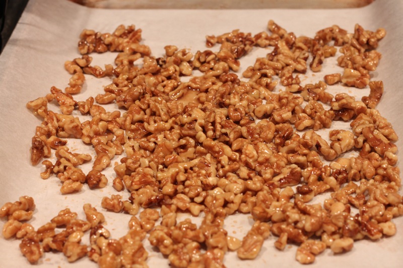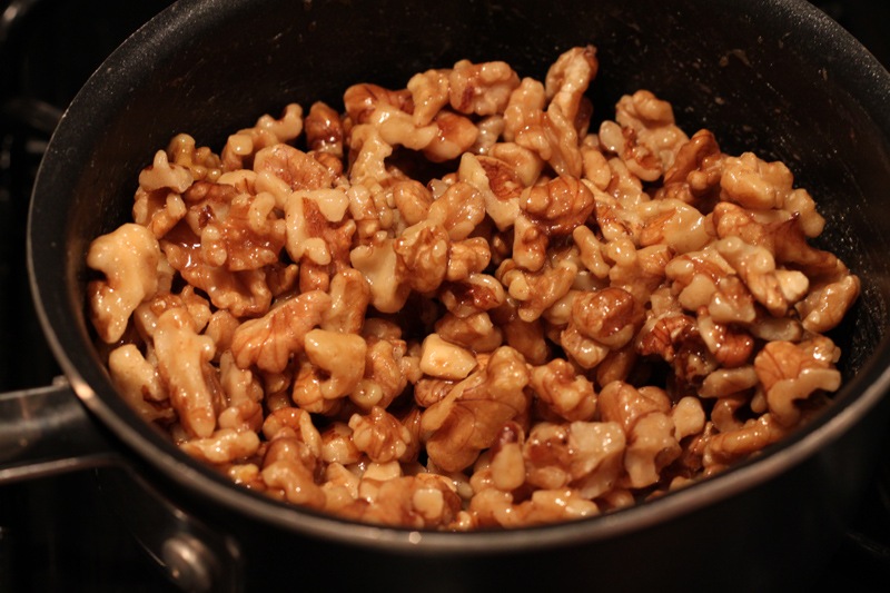 Once the mixture begins to boil, add the walnuts, toss to coat thoroughly, and spread out on parchment paper to cool. The nuts will remain wet and sticky even when they are cool. They can be kept in an airtight container in the fridge for up to a week.