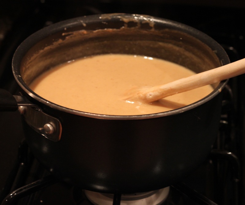 While the base is done, prepare the egg yolks for tempering. Whisk them together in a separate, heat-safe bowl. To temper the eggs: Take a cup of the hot mixture and slowly pour it into the bowl of yolks, whisking quickly and constantly. You have to do this slowly or you’ll end up with scrambled eggs. I mix in just about 3 cups of my hot mixture before the temperature is up high enough to pour the entire bowl back into the sauce pan without scrambling the eggs.