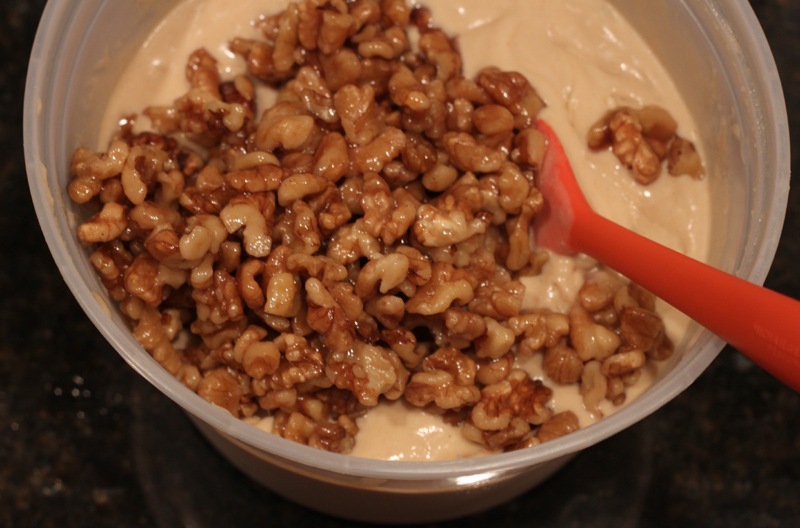 Transfer the ice cream into a tupperware container. Stir in 2/3 of the candied walnuts. Store the rest in an airtight container in the fridge and use for garnish.