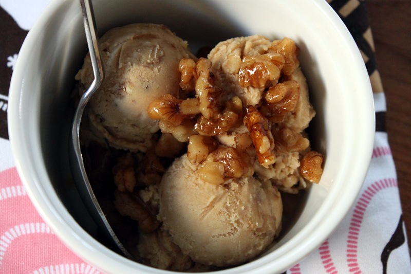 This ice cream is sweet, full of great maple flavor, and has great texture because of the walnuts. The cinnamon also adds the perfect hint of depth and warmth. A lovely Fall treat!