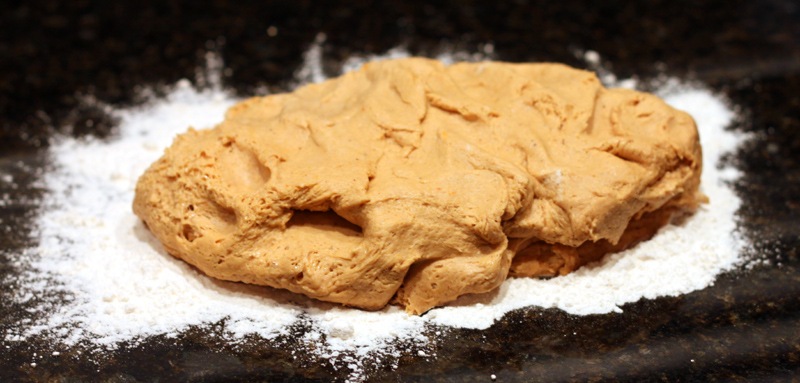 When the dough has doubled in size, it’s time to make the rolls! On a floured surface, roll the dough out into a large rectangular shape.