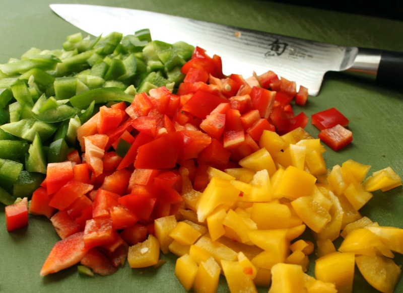 While the sausages are browning, chop the peppers and onions into small pieces. When the sausages are done browning and in the oven, sauté the onions, peppers, and EVOO in the same pot used for the sausages for about 7-9 minutes.