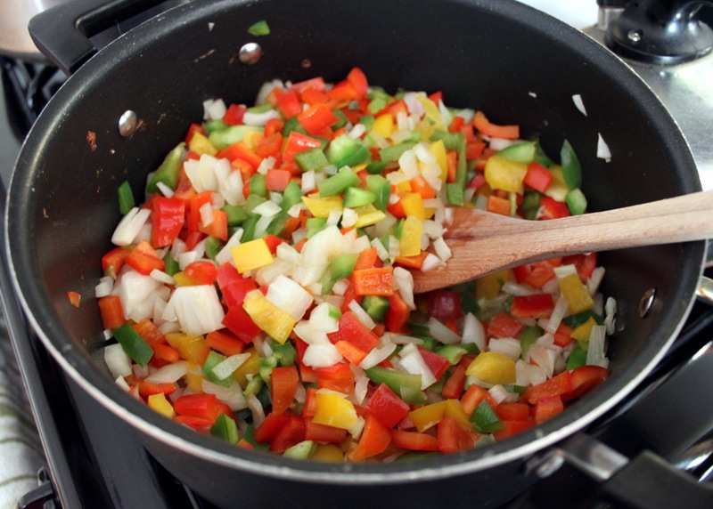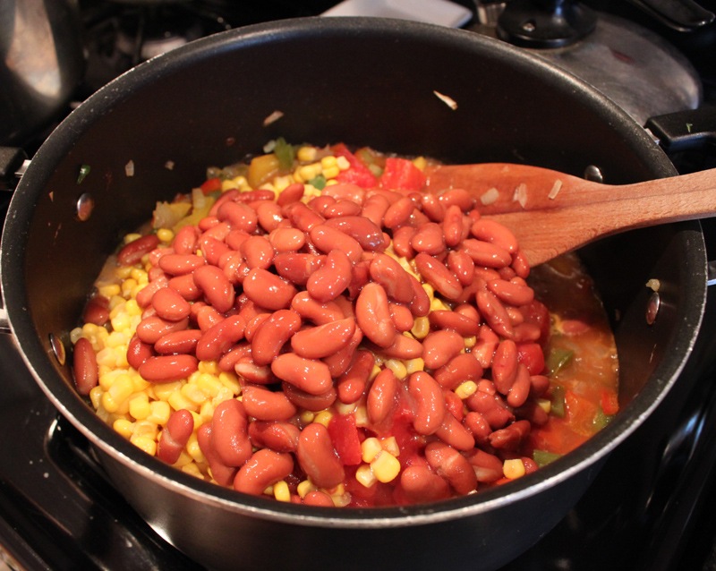 Once the vegetables have softened and start to brown, add the spices, tomatoes, corn, garlic, and beans.