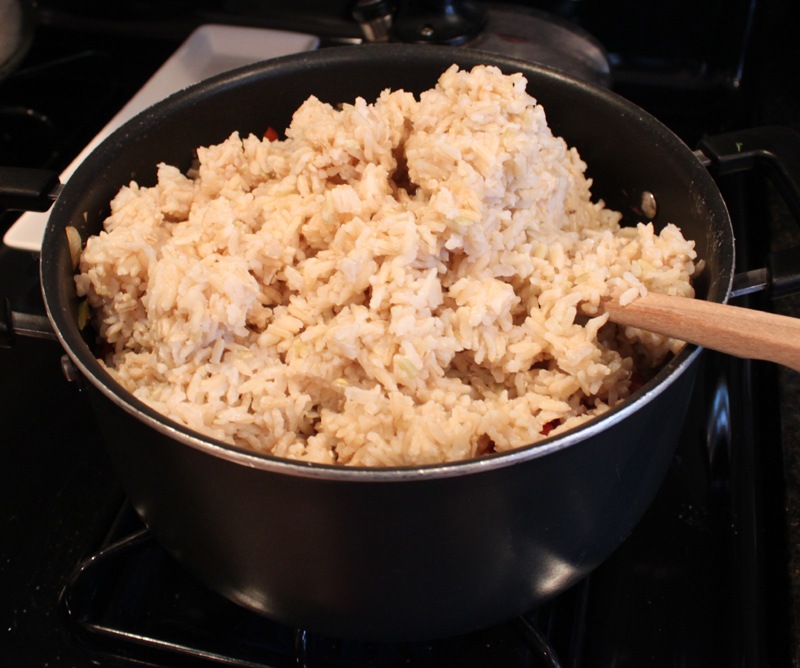 When the vegetables and beans are done cooking, and in the rice and stir thoroughly. Taste for seasoning and adjust as needed.