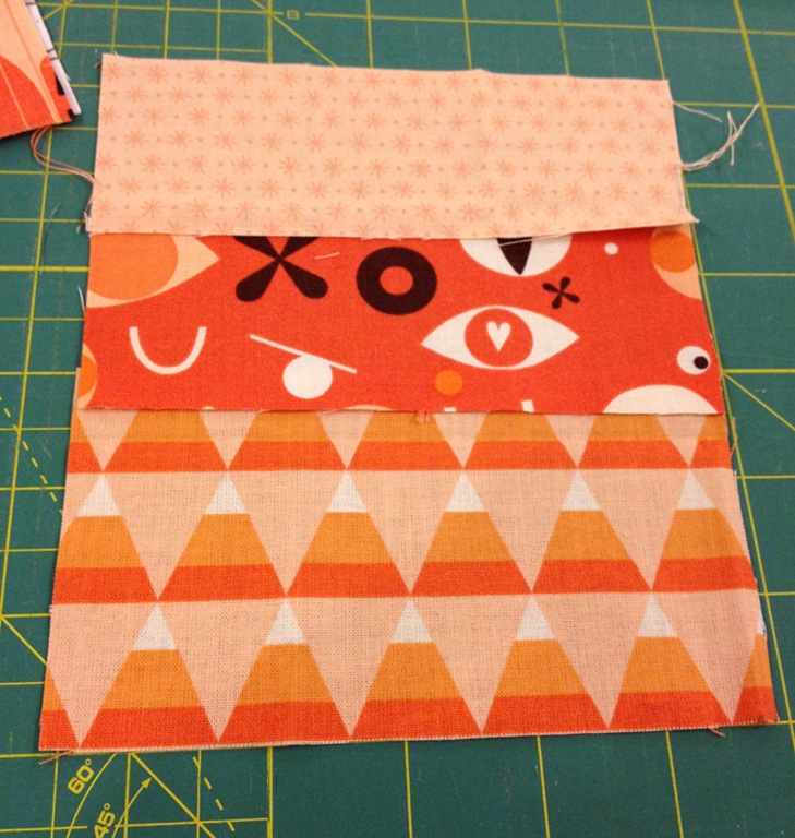 We sewed the candy corn fabric layers together, and then sewed the candy corn design to the background fabric. Side note: I had never used a Bernina machine before and I was so impressed! They are smooth and so easy to use. If they didn’t cost like $3,000, I would buy one in heartbeat.