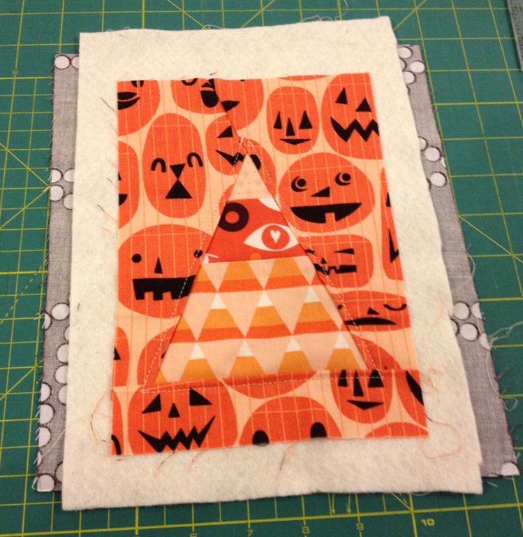 Once the candy corn was sewed to the background fabric we pieced everything together – the backside, batting in the middle, and design on top.
