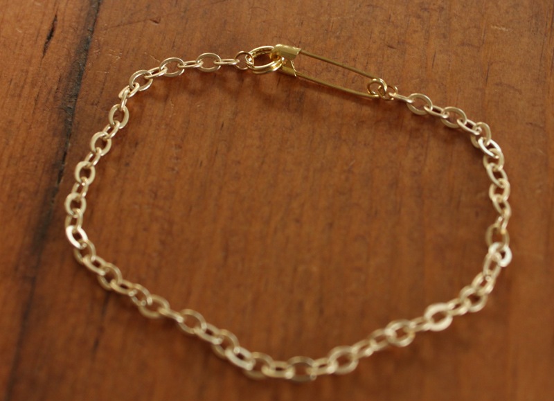 The materials you’ll need for this bracelet are pretty simple: jewelry pliers, a length of faux gold chain measured to fit your wrist (the circumference of your wrist plus 1/4 inch), two differently sized jewelry o-rings, and a mini gold safety pin.