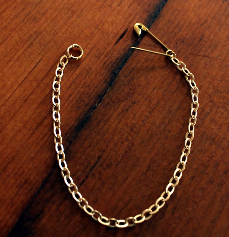 Clasp the top of the safety pin to the end of the chain with the larger o-ring. The o-ring should slide between the upper notch in the safety pin. You can use the jewelry pliers to widen that space if need be. And that’s it – you made a safety pin bracelet!
