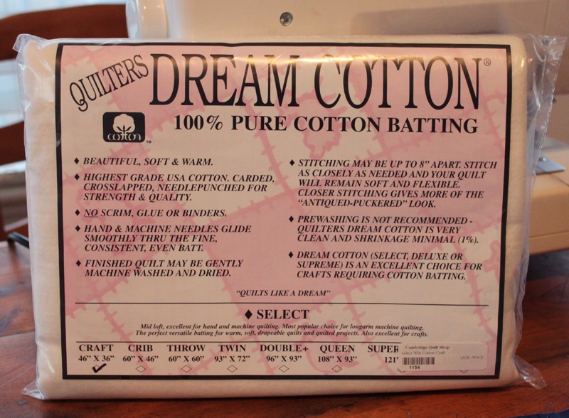 A word about cotton batting. My book highly recommends using all cotton materials in quilting – fabric, thread, and batting. It is a more natural fabric that will wash and wear nicely, and won’t fall apart on you. The book recommends Dream Cotton as their batting of choice. It comes in many different sizes so I started with the craft size (46” x 36”). Which, incidentally, I found at my local quilt specialty shop: Cambridge Quilt Shop (an awesome local find!).