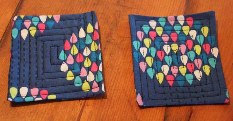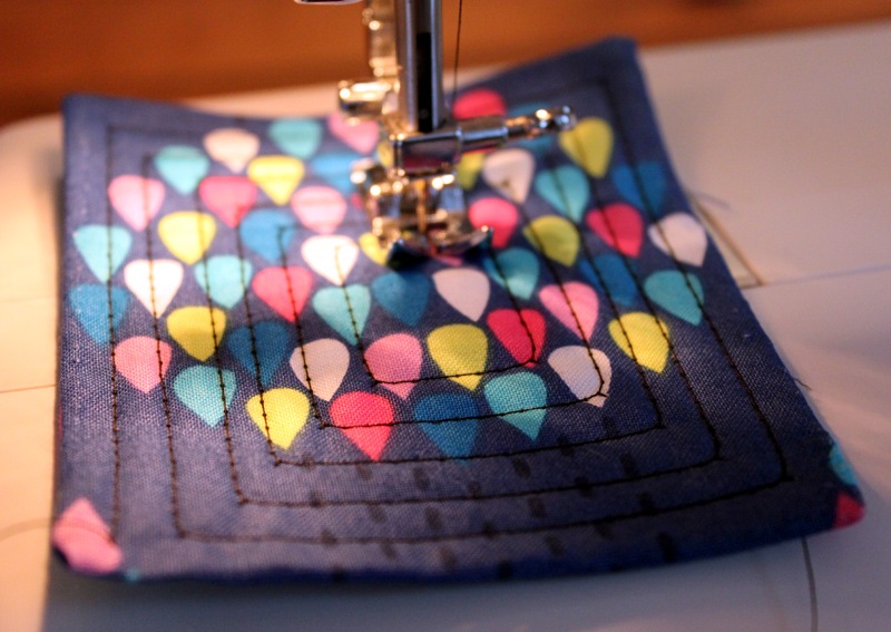 The key to quilting a small item like these coasters is to keep the sewed lines straight and parallel. Using the sewing foot and plate of the machine are both easy ways to stay on track. I eyeballed this process since the coaster is small. I imagine once I start quilting larger items I will have to dart, or mark, the fabric.