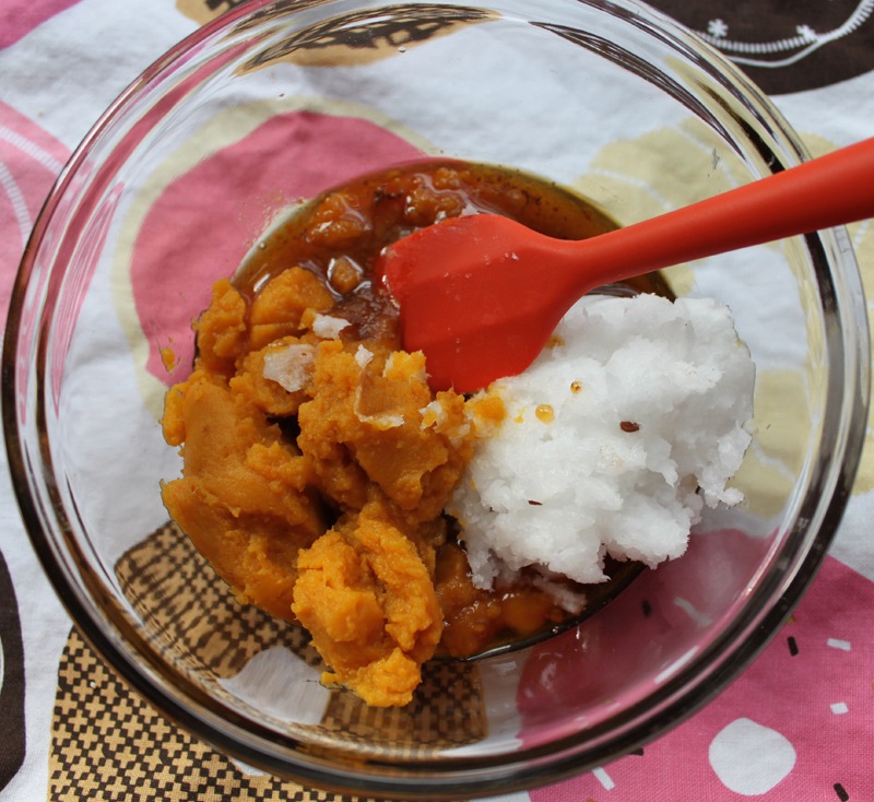 Mix the rest of the ingredients (syrup, oil, pumpkin, vanilla, spices) together thoroughly in a small bowl. It’s alright if the coconut oil is a little chunky, it’ll melt down in the oven. I loosened mine up slightly in the microwave before mixing it into the pumpkin mixture though. It doesn’t look super appetizing but trust me, this will be tasty.