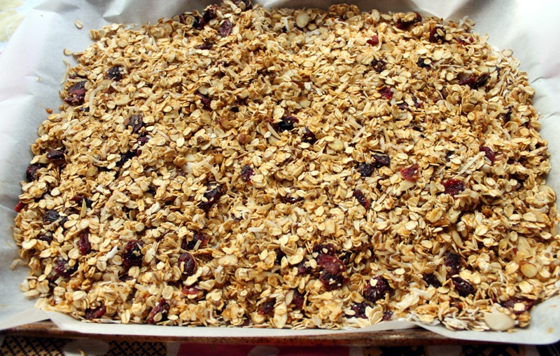 Mix the first 5 ingredients (oats, almonds, coconut, flax seed, cranberries) together in a big bowl.
