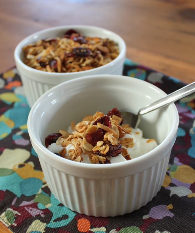 I love making granola but for some reason it makes the most sense to me in the Fall. This version, flavored with pumpkin and spiced with cinnamon and nutmeg, is a real toasty treat.