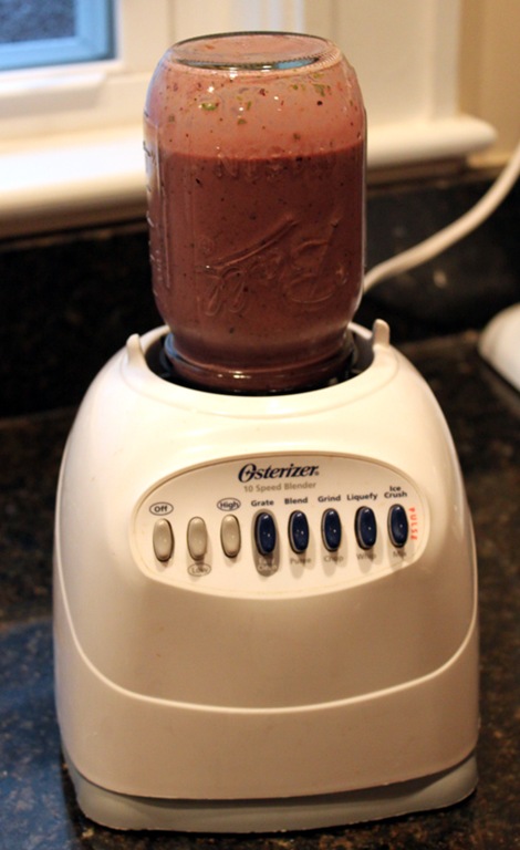 A mason jar will fit perfectly on your blender with the blender blade attachment. Simply screw it on to the bottom of the jar exactly how you would with the full sized blender container. It couldn’t be simpler. I used a 12 oz. mason jar here but I think any size (except wide mouthed jars) will work here.