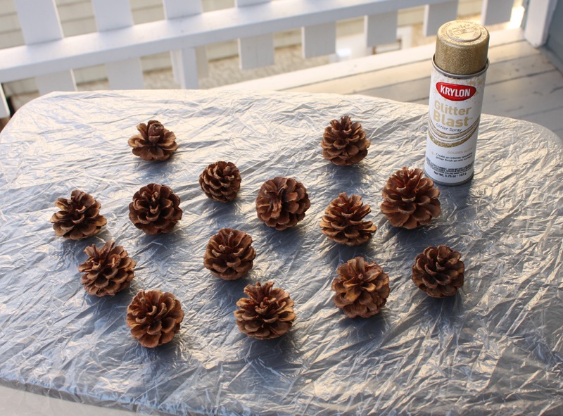 Spray liberally with the glitter spray and allow the pinecones to dry between coats. I ended up doing 3 coats on these guys and used up the whole can doing so.