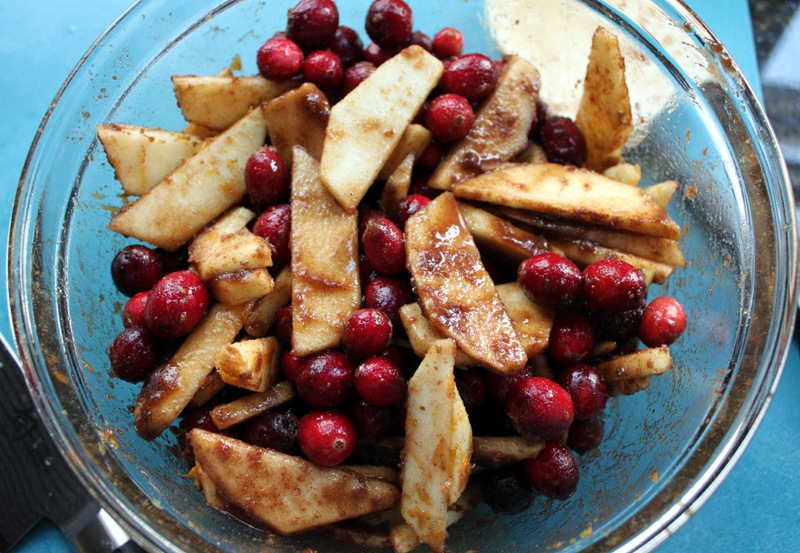 Start by prepping the fruit. Rinse the cranberries and pick out any bad ones. Peel and thinly slice the apples as well.