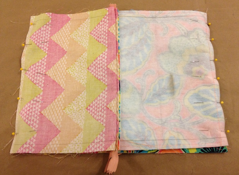 We sewed an interfacing layer on to the exterior fabric that will help keep the shape of the box bag. After the interfacing was on we sewed the zipper on to both sides of the exterior fabric.