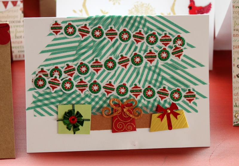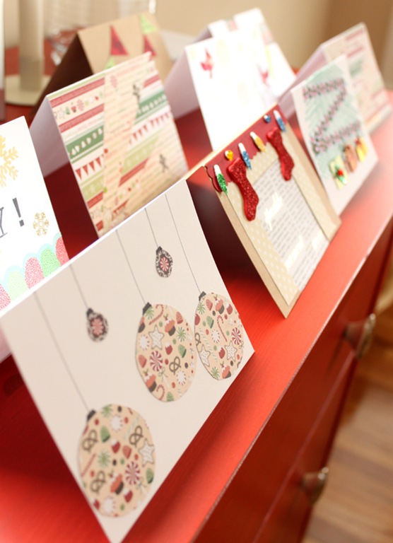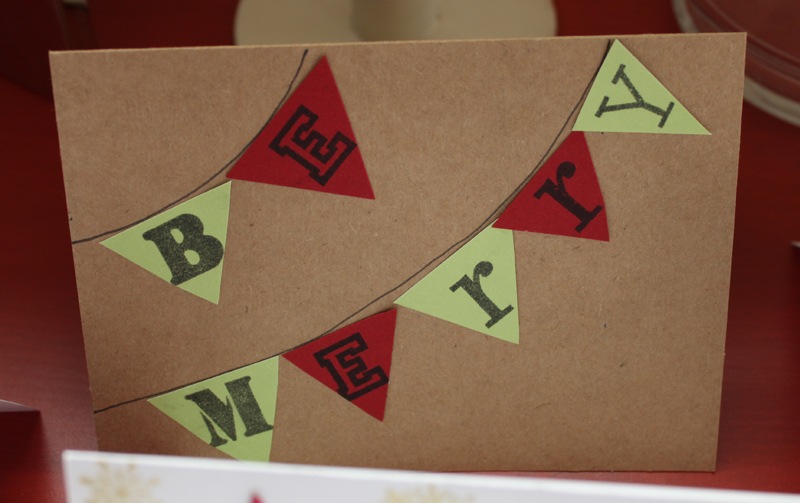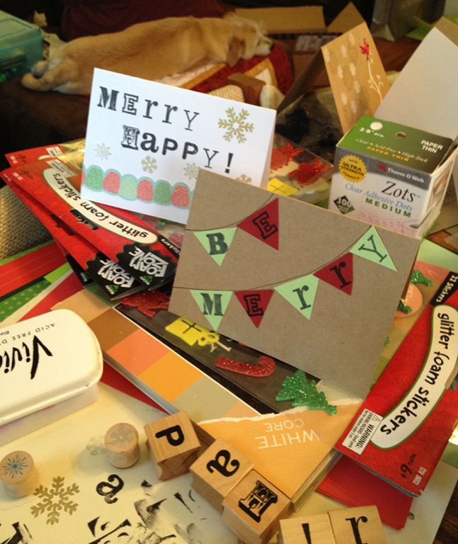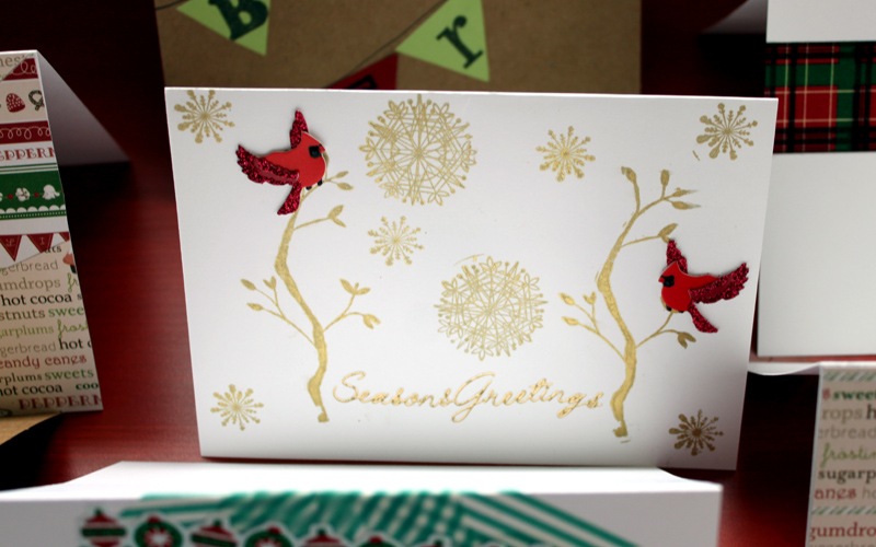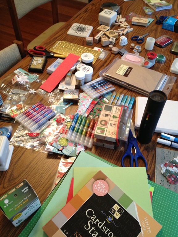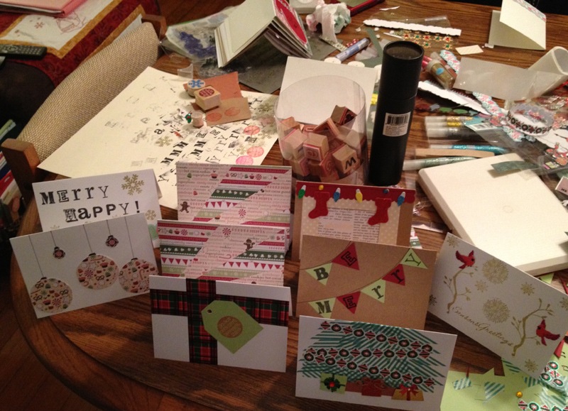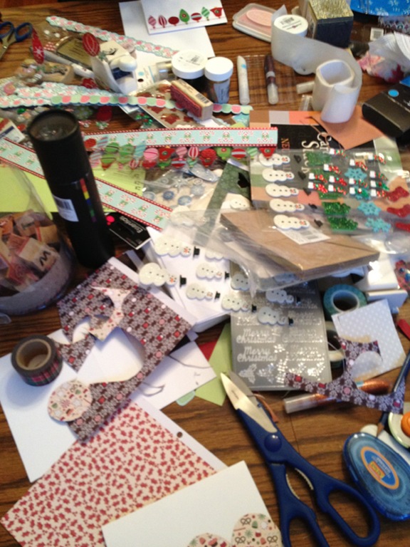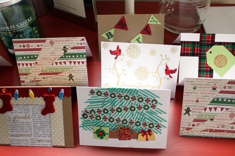 Every year my friend Claire hosts a holiday card making party. All of our crafty lady friends get together to chat, eat tasty treats, and make holiday cards. It’s a great tradition; I look forward to it every year. Everyone brings their crafting supplies which is great because there is a lot to choose from.