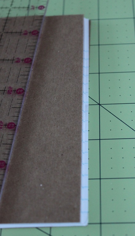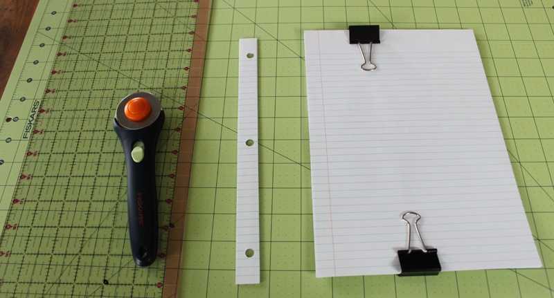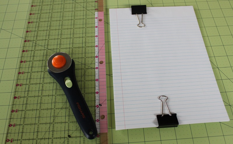 Start by clipping together a stack of notebook paper. Using the ruler and rotary cutter, cut off the edge and/or holes.