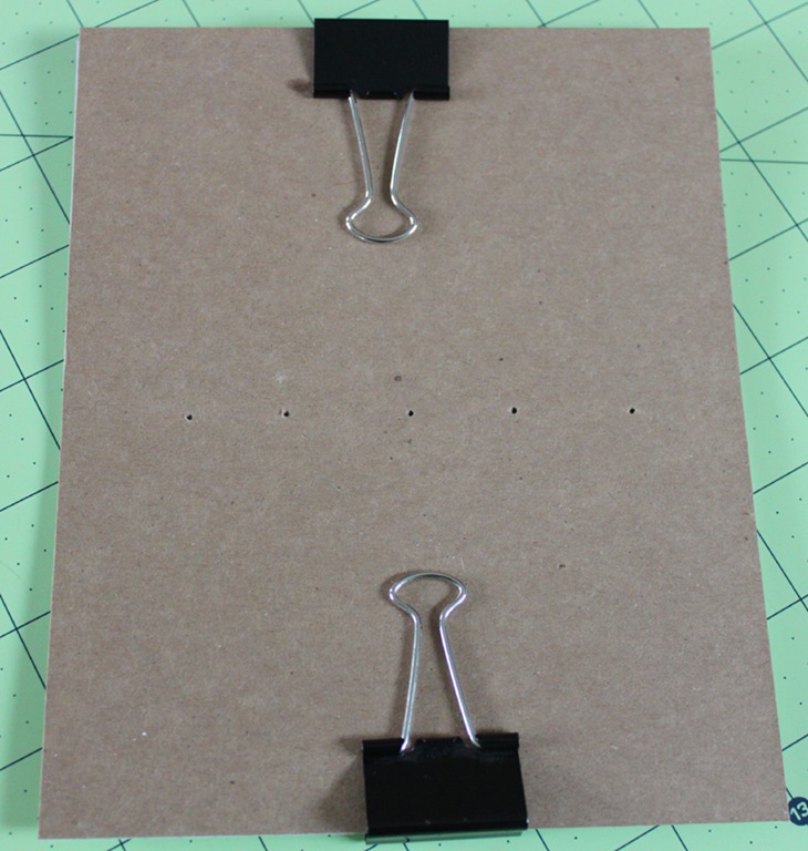 Clip the front cover, back cover, and notebook paper together with the binder clips. Position the template on top to use as a guide. Using an awl or piercing tool, poke holes down through all of the layers. You don’t want to make huge holes here, there should be just enough space to get the tapestry needle through each layer.