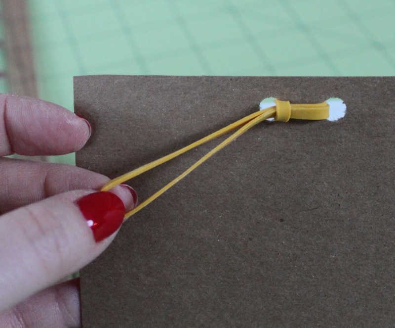 Using a hole punch, punch two single holes 1/4 inch away from the edge of the notebook cover. Insert both ends of an elastic band through each hole, loop one end through the other, and pull tight.