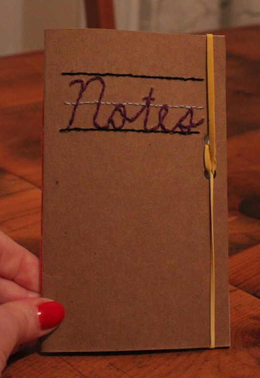 Alternating stitches from the inside to outside, I sewed the binding so that I had a piece of cord from hole to hole on the inside and outside of the notebook. I hope that makes sense, if not watch the SeaLemonDIY video I linked to at the beginning of this post.