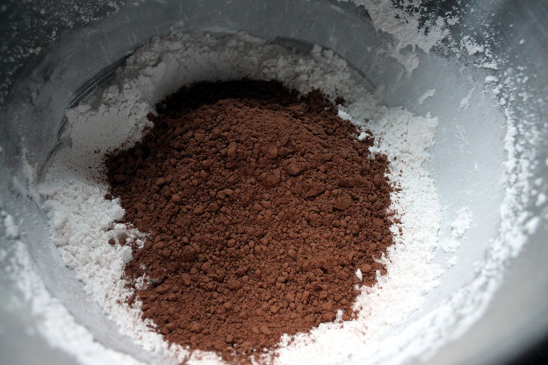 Combine the sugar and cocoa in a big bowl or stand mixer. Then stir in the coconut and chocolate chips.
