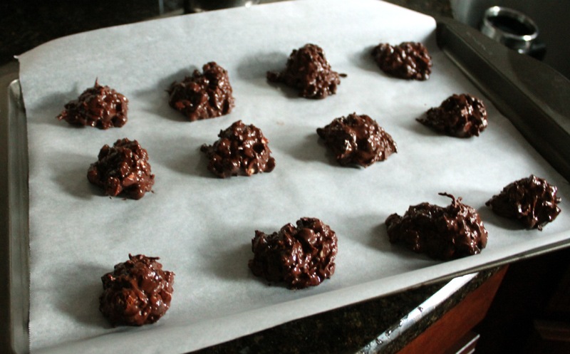 Make sure the ingredients are thoroughly combined. Scoop with a spoon or small disher (I use my handy dandy #20 ice cream scooper) onto a parchment paper lined baking sheet.