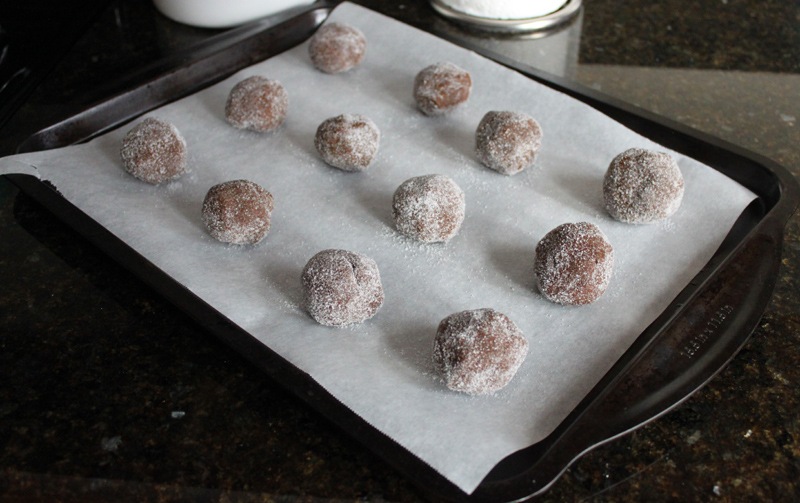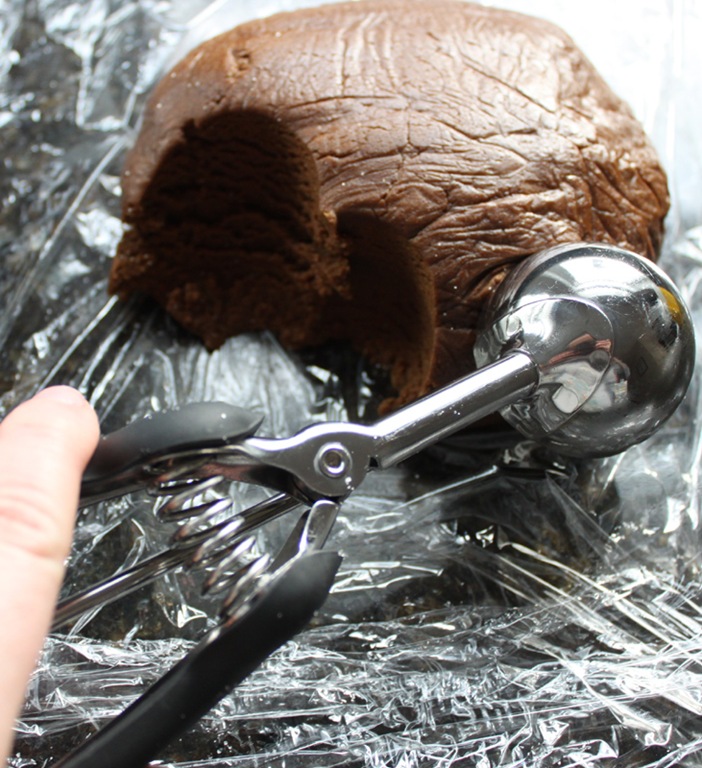 Scoop the dough into 1” balls with a spoon or small disher (I use my handy dandy #20 ice cream scooper). Roll in your hands to make the shape as uniform as you can.