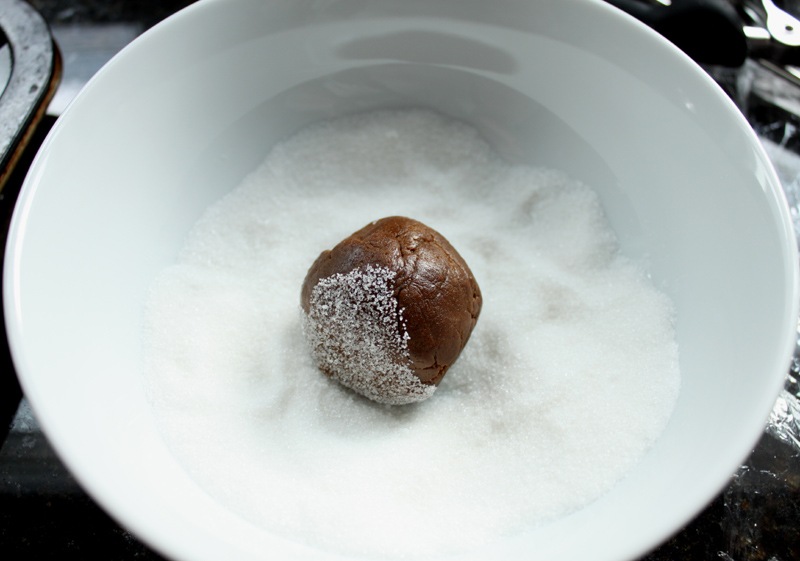 Measure out 3 tbsp. of granulated sugar and place in a small bowl. Roll each cookie dough ball around in the sugar until the entire surface is coated.