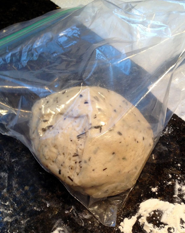 Once the dough has risen, divide the dough ball in half with a dough scraper. I put each half in a freezer bag and froze it until I was ready to make the bread. When I was ready to use it I put the frozen dough in the fridge for 3 days to thaw. The day before I wanted to bake the boule I kneaded each dough ball, dusted a paper towel with flour, lined a big bowl with the paper towel, placed the dough inside, and put the dough back in the fridge overnight to rise.