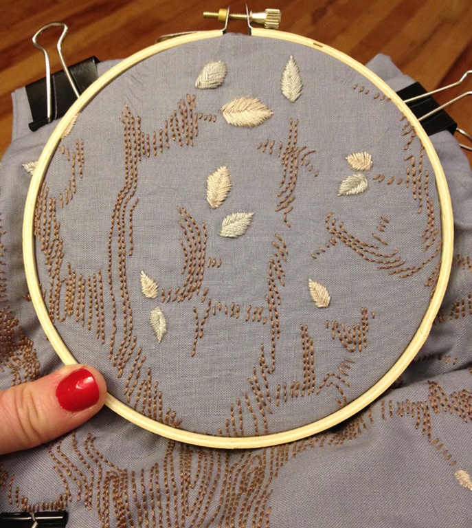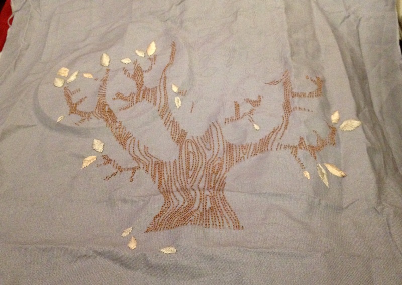 A full view of the tree in progress (it’s a bit hard to see because of the hoop lines/wrinkles):