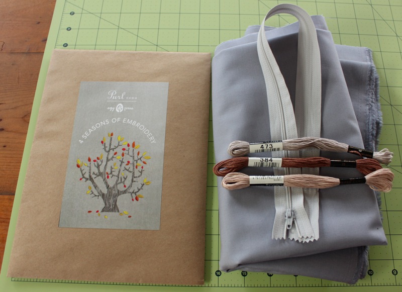 This one requires some back story: My sister-in-law, Gina, is getting married in August and I really wanted to get her a bride-y Christmas gift. My first thought was a lingerie bag; it’s traditional, it’s sweet, it’s girly. I checked out Etsy but there was nothing that impressed me on there. Feeling bummed, I started to brainstorm. It hit me immediately – I’ll just make my own lingerie bag for her. Because I’ve been feeling more confident in my embroidery chops I decided I’d embroider something for her then make a bag out of it. When I saw this pattern on The Purl Bee I knew it would be perfect. (Does it look familiar? I dropped a tiny hint about it here.) I ordered the pattern and waited for it to arrive. Once I got it I picked out the color scheme – blue-gray fabric with silver-gray, brown, and champagne embroidery. I also picked up a zipper too now that I know how to sew on a zipper.