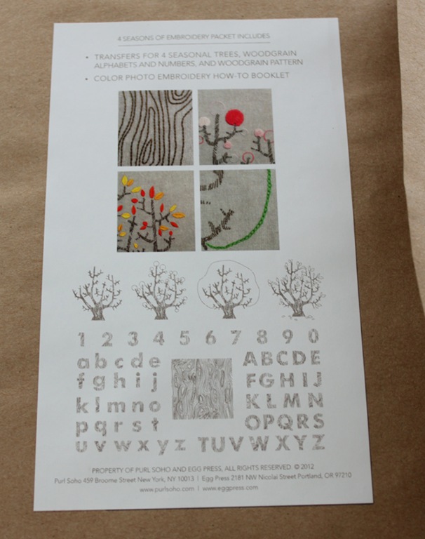 The pattern features four seasonal tree designs as well as the alphabet (uppercase, lowercase, & numbers) in a woodgrain design.