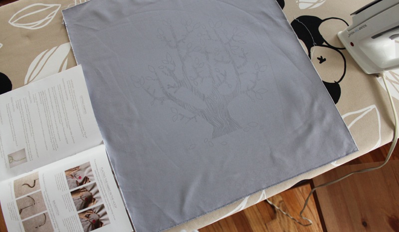 I centered and ironed on the tree design first. My goal was to get the design perfectly centered to give me a really large seam allowance on the edges of the fabric.