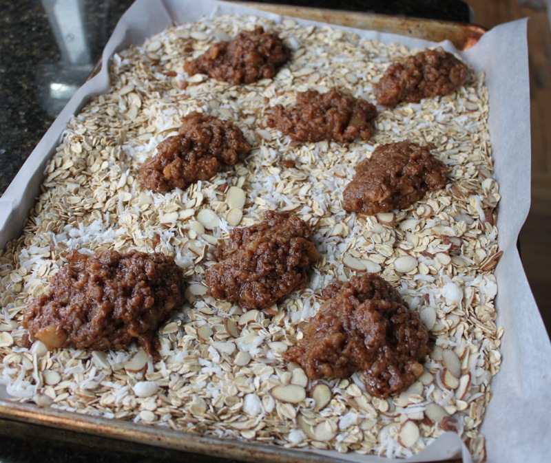 As the applesauce is cooking mix the oats, almonds, and coconut together in a big bowl. Spread the dry ingredients out into an even layer on a parchment paper lined baking sheet.