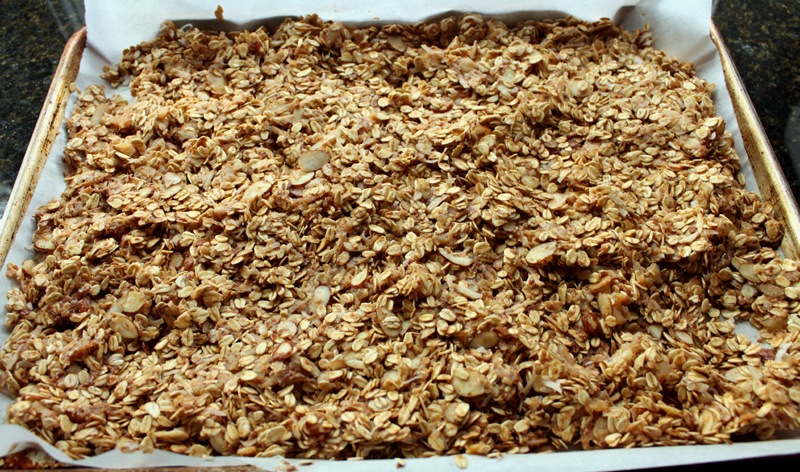 Bake on 325 for 15 minutes. After 15 minutes, take it out of the oven and stir the bottom layer up to the top. Return to the oven for another 10 minutes and repeat the stirring until all of the granola becomes dry, crispy, and browned. This took about 45 minutes total for me – 5 rotations of 10 minutes, stirring up the mixture in between each rotation.
