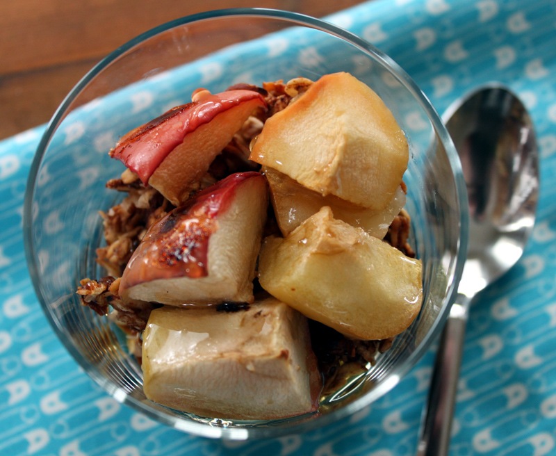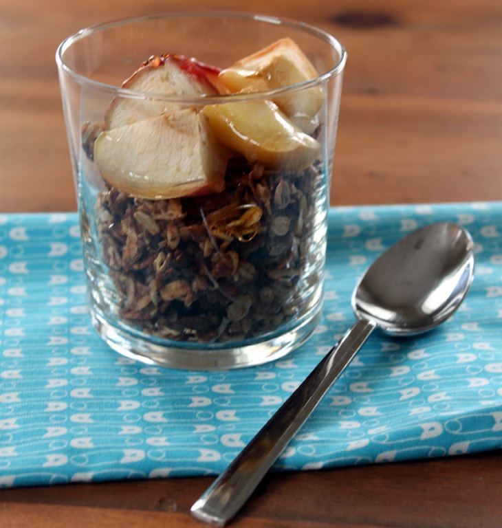 This made a delicious, healthy, and apple-rific breakfast. I took 1 cup of the granola, topped with a handful of baked apples pieces, and drizzled with honey. You could also serve this with a cup of yogurt or cup of milk poured over the top.