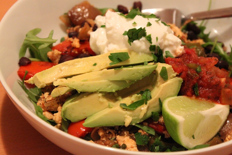 3. Divide the greens and, in two bowls, make a bed at the bottom with them. Spoon half of the meat in to each bowl and then half of the sautéed veggies. Slice up the avocado and warm the black beans, and add to the top. Garnish with greek yogurt, salsa, lime, fresh parsley.