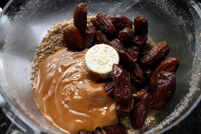 After the almonds are ground, add the rest of the ingredients to the food processor and pulse together. If you find the mixture is not wet enough or is not coming together, add a few teaspoons of water. The mixture is not going to be completely smooth, it will have some texture, but it should stick together when pinched between your fingers.