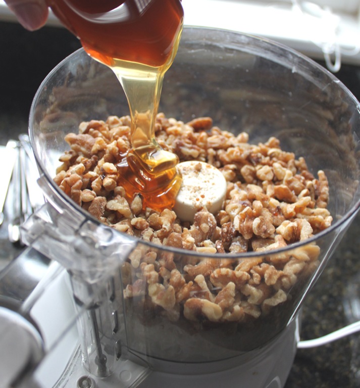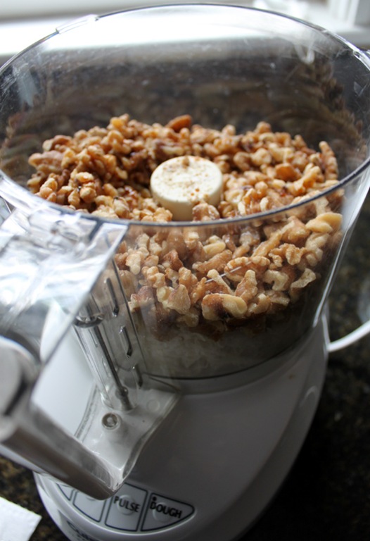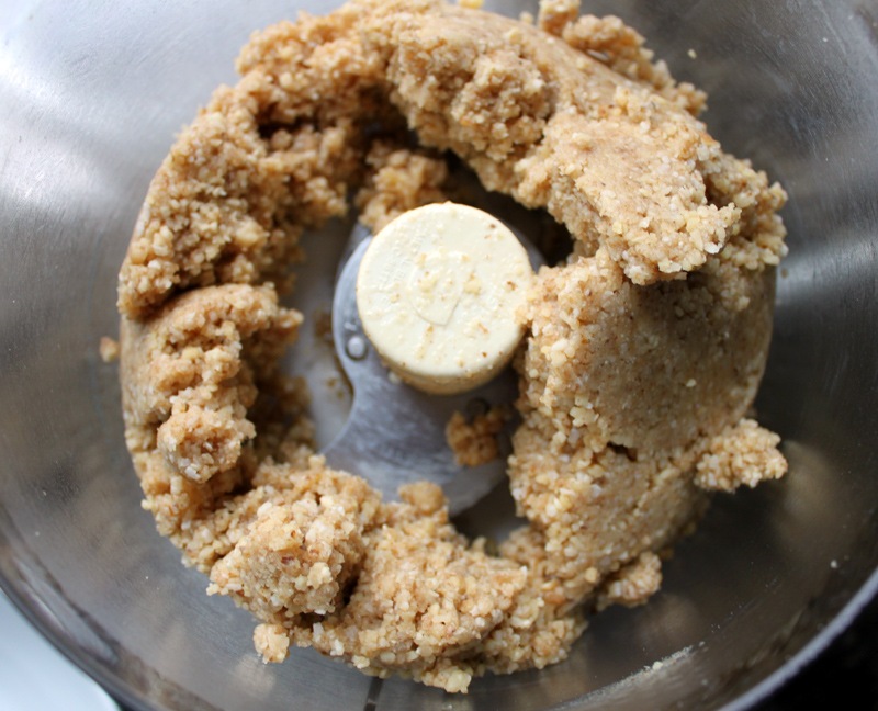 Pulse the mixture until the walnuts and coconut are ground down and look like breadcrumbs. The mixture is not going to be completely smooth, it will have some texture, but it should stick together when pinched between your fingers. If you find the mixture is not wet enough or is not coming together, add a few teaspoons of water.