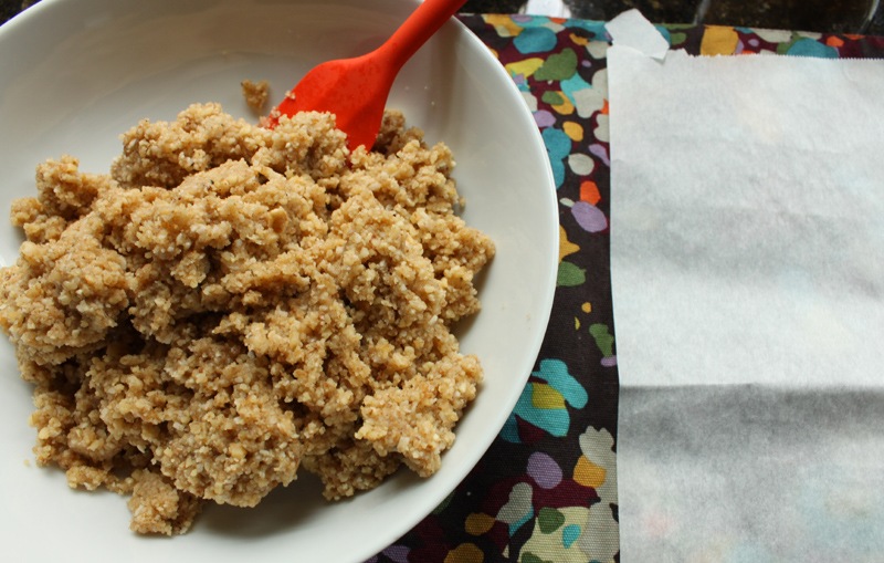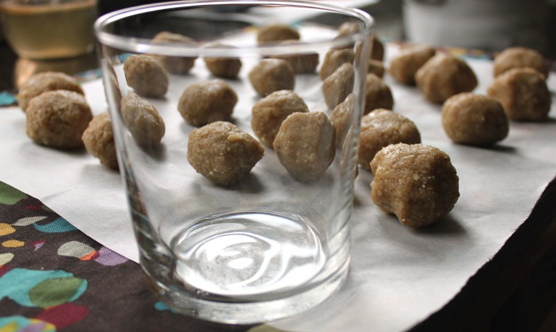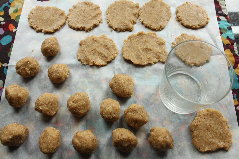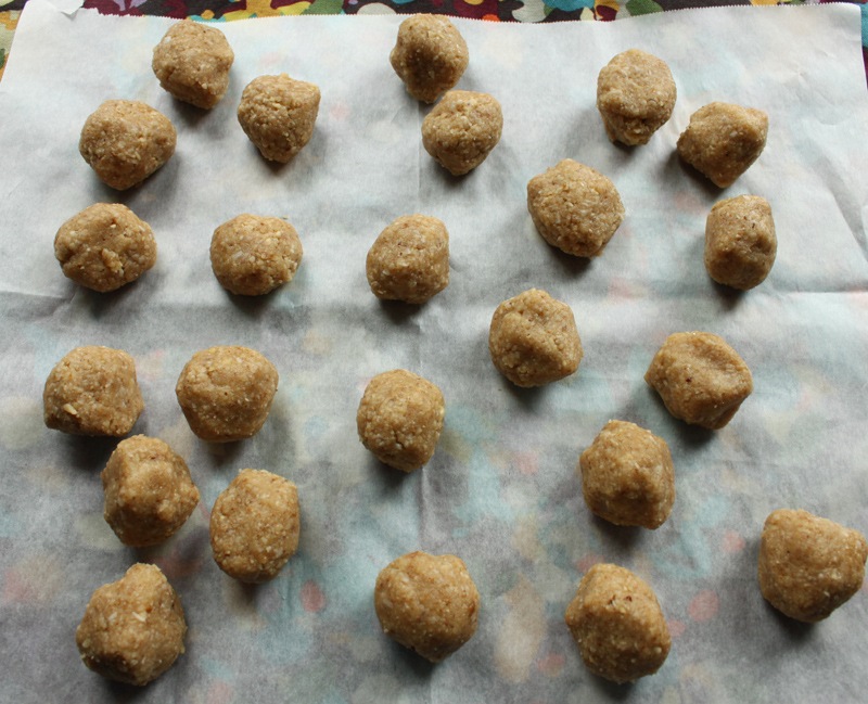 Transfer the “dough” into a large, shallow bowl. This will make for much easier cookie dough rolling. Have a cookie sheet lined with either wax or parchment paper nearby. Roll the “dough” into 1 inch balls and place on the paper.